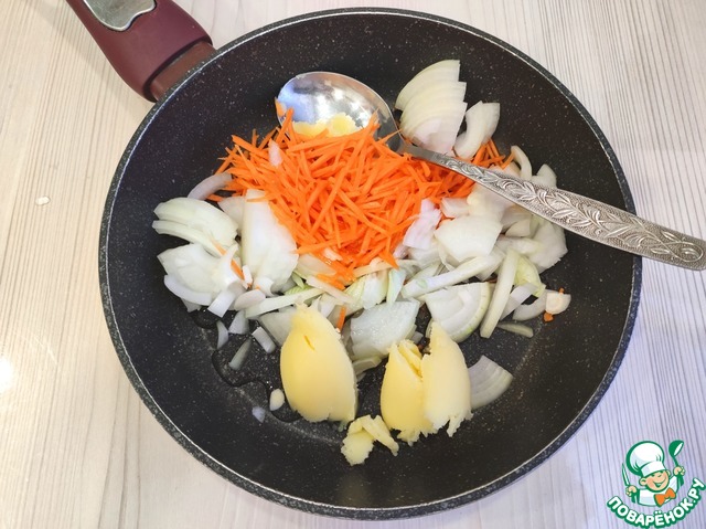• Сковороду поставить на средний огонь и пассеровать овощи до легкой золотистой корочки