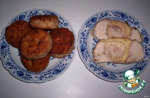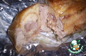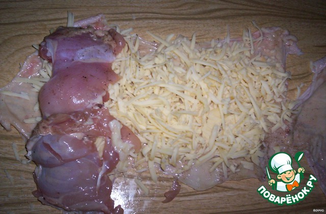 - на вторую кожу положить куриные грудки, положить рулет с сыром,
