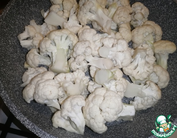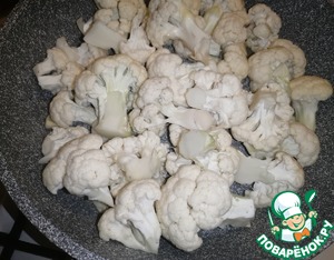 Цветную капусту разобрать на соцветия и добавить в сковороду. Обжарить вместе с чеснок 2 минуты. Налить воды. Накрыть крышкой и тушить 10 минут.