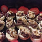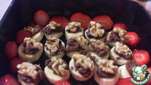 Часть орешков оставить для украшения, остальные перемешать с растопленным шоколадом. Получившейся массой "нафаршировать" бананы. Сверху украсить орешками.