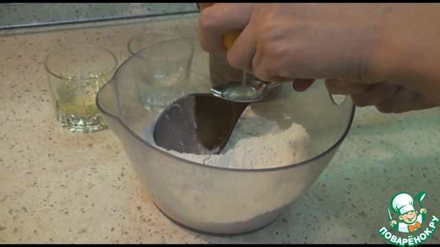 В муку добавляем соль, перемешаем. Выдавим сок лимона, если нет, можно добавить уксус.