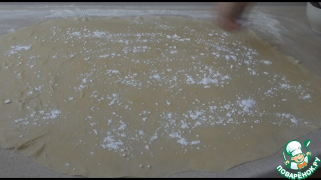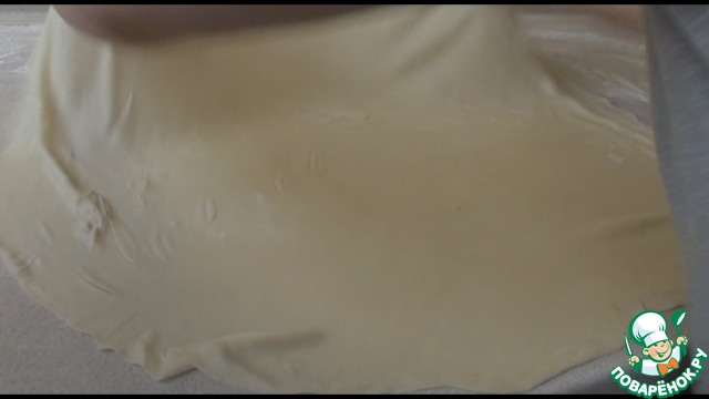 Потом раскатываем как можно тоньше, припыляя по надобности мукой. Тесто податливое, очень хорошо раскатывается.
