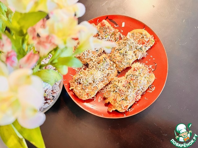 Подготовленные измельченные продукты смешиваем с яйцами. Смесь выкладываем на ломтики батона, равномерно распределяем по всему ломтику и начинкой вниз выкладываем на сковороду, обжариваем до золотистого цвета. Переворачиваем, уменьшаем огонь до минимума и посыпаем тертым сыром. Оставляем под закрытой крышкой на маленьком огне, пока сыр не расплавится - тогда сыр получается мягеньким и хорошо тянется, а сами бутерброды приобретают хрустящую корочку.