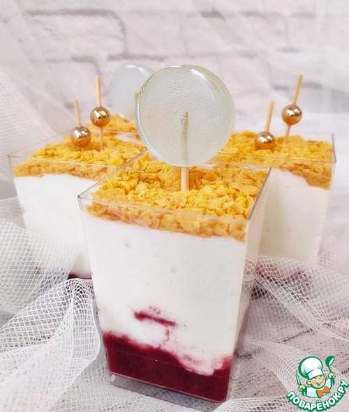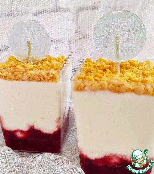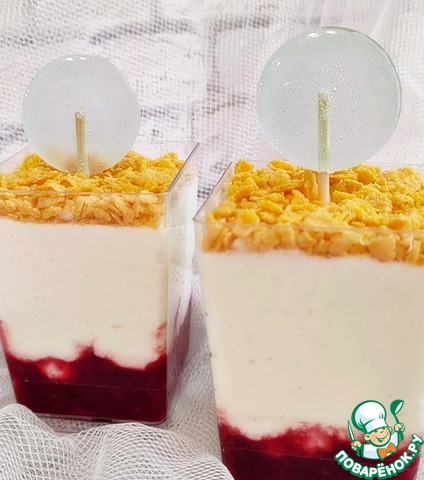 Затем украсьте десерт по своему вкусу - свежие ягоды, шоколадная крошка, печенье, карамельная посыпка и т. д. Я украсила кукурузными хлопьями, предварительно перебила их в кофемолке.