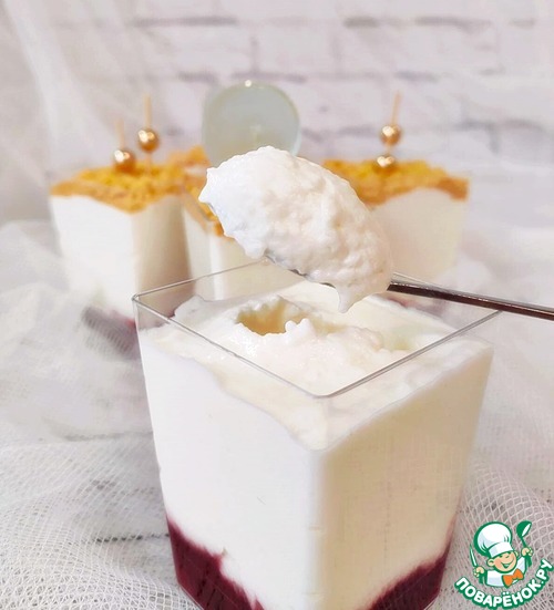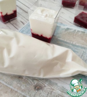Готовую творожную массу разложите поверх фруктового пюре. Я делаю это с помощью кондитерского мешка, но можете разложить и ложкой.