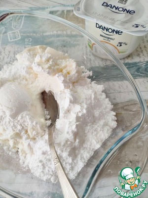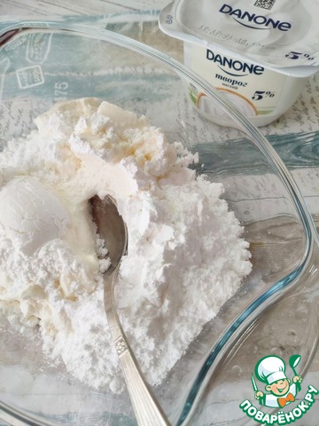 В отдельной ёмкости соедините мягкий творог (комнатной температуры) и сахарную пудру. Хорошо всё перемешайте.