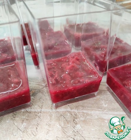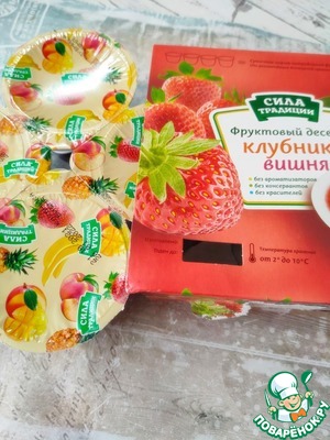 Я использую вот такое фруктово-ягодное пюре. В его составе только ягоды, фрукты и сахар. Пастеризовано. Но можете использовать домашнее варенье, сезонные ягоды, детское пюре, консервированные фрукты и ягоды.