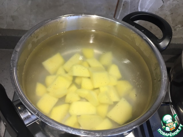 Закидываем в воду картофель и варим его до готовности.