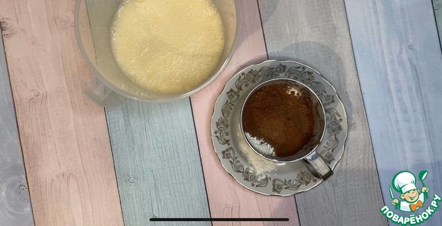 Теперь приступим к сухим ингредиентам. К муке добавим разрыхлитель, какао и крахмал. Все это потихоньку добавляем к жидкой смеси, при этом взбивая миксером. -