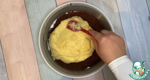 Остывший бисквит делим на 2 части. Желательно торт собирать в кольце. Крем выкладываем на 1 часть и сверху закрываем вторым коржом. Убираем в холодильник на 3-4 часа.