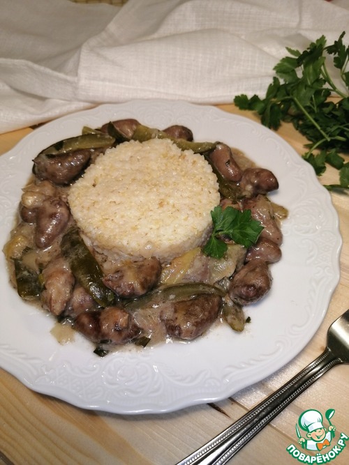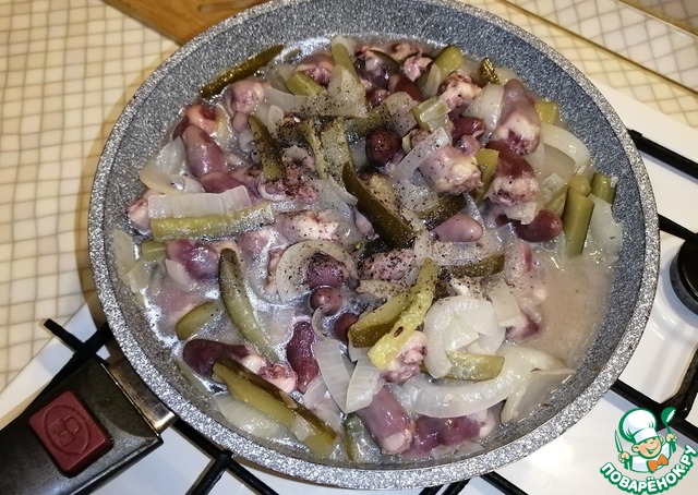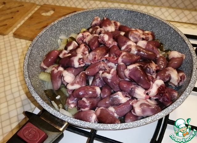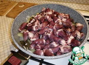 Сердечки хорошо промыть и высыпать в сковороду к остальным ингредиентам.