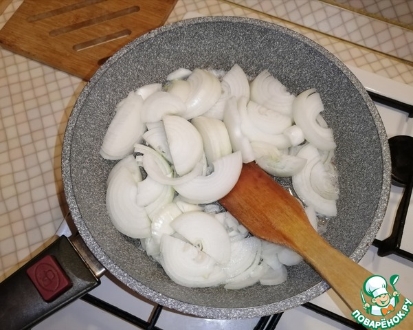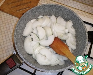 Лук нарезать полукольцами и высыпать в сковороду. Обжарить на среднем огне 3-4 минуты.