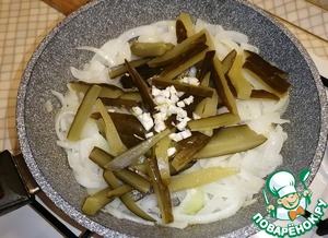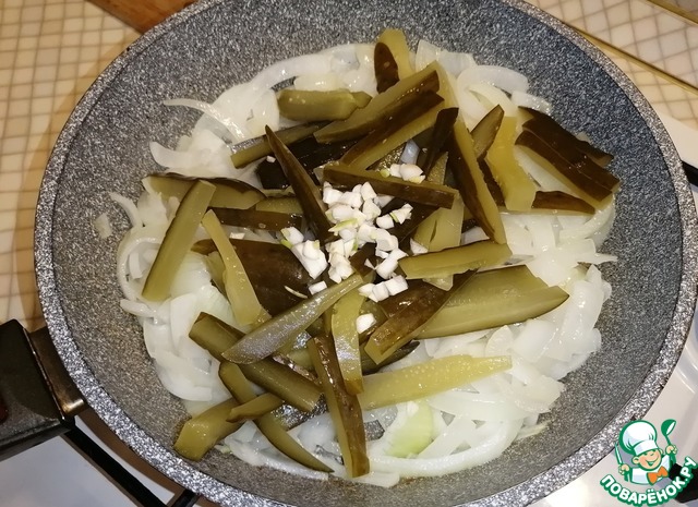 Добавляем к луку нарезанные длинными полосками солёные огурцы и мелко нарезанный чеснок. Хорошо перемешиваем. Жарим 3 минуты.