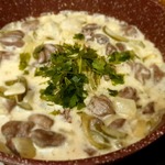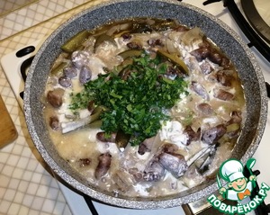 В сливки комнатной температуры добавить муку и хорошо размешать, чтобы не было комков. Влить в сковороду. Нарезать петрушку и тоже отправить в сковороду. Перемешать и тушить ещё 15 минут. Готово.