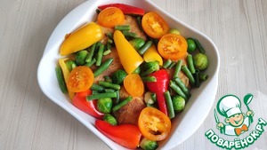 В форму добавить 1 ст. ложку растительного масла, добавить обжаренные окорочка. Овощи (в данном рецепте использовалась заморозка): брюссельскую капусту, стручковую фасоль, сполоснуть в теплой воде, при необходимости удалить подвядшие листочки, выложить на куриные окорочка. Добавить по вкусу соль и черный молотый перец, сверху конструкцию полить растопленным сливочным маслом. Форму в окорочками и овощной смесью поместить в разогретую до 180С духовку, предварительно форму прикрыть фольгой. Запекать блюдо до готовности овощей.
