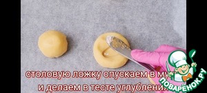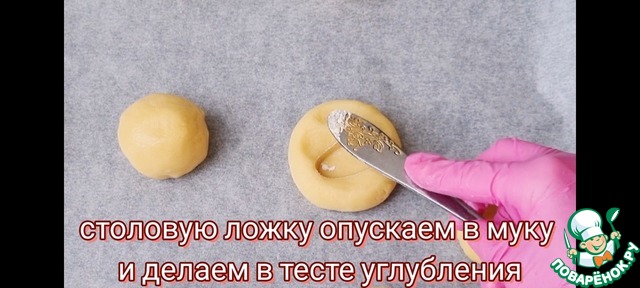 Затем берём немного теста и формируем шарики по размеру чуть больше, чем грецкий орешек. У меня вышло 10 штук. Отправляем шарики на противень, застеленный пергаментом. Теперь шарик слегка придавливаем пальцами, затем берём столовую ложку опускаем в муку и в тесте делаем углубления как показано на видео.