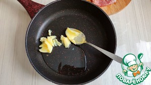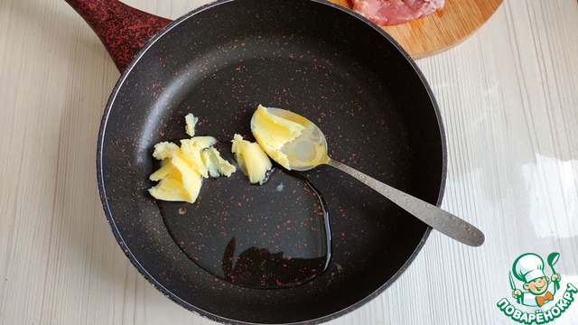 На сковороду добавить растительное масло (5 ст. ложек) и топленое масло (3 ст. ложки. Сковороду поставить на средний огонь, добавить нарезанную свиную вырезку и обжарить мясо до легкой золотистой корочки и выпаривания лишней влаги.