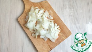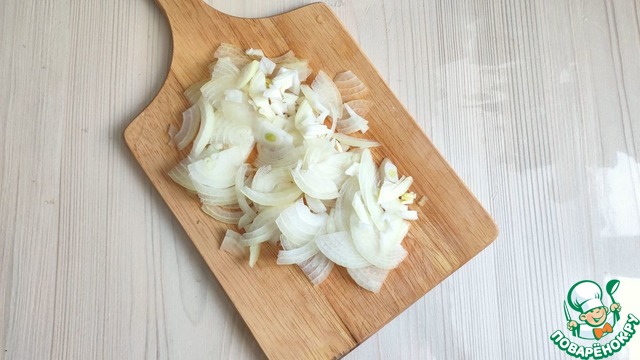 Пока обжаривается мясо, репчатый лук (1 шт.) нарезать полукольцами,