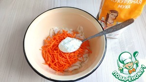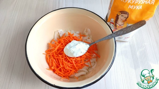 В миску добавить нарезанный репчатый лук и морковь, добавить кукурузную муку. Овощи перемешать вместе с мукой.