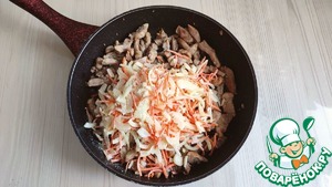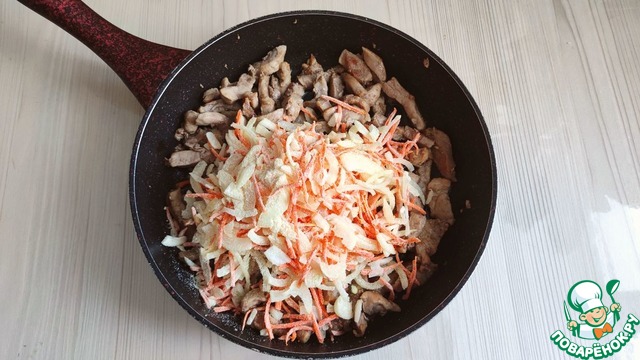 В обжаренное мясо добавить лук и морковь, обжарить смесь в течение 5-10 мин.