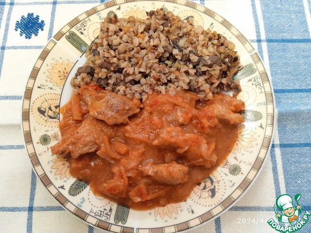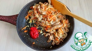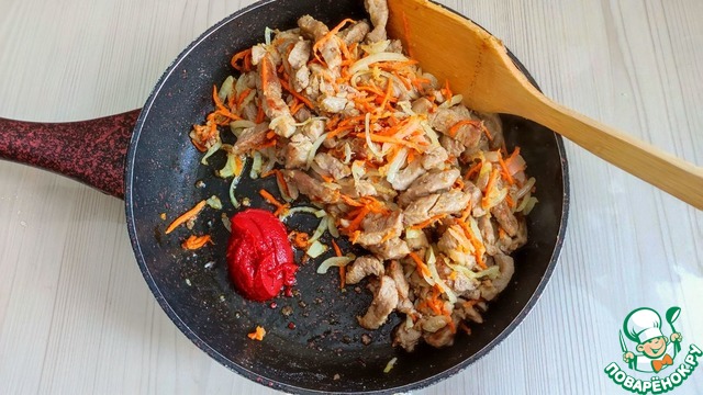Далее мясо и овощную смесь отодвинуть на край сковороды, добавить 1 ст. ложку томатной пасты и пассеровать, помешивая, томатную пасту в течение 3-5 мин. Далее добавить 450 мл. кипяченой воды, лавровый лист (1 шт.), соль и черный молотый перец добавить по вкусу.