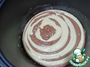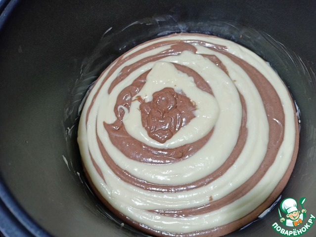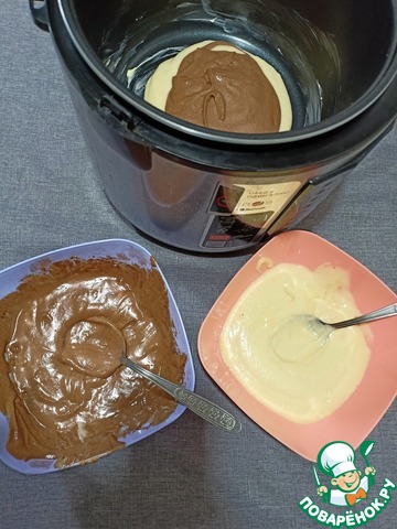 • Смазываем борта и дно чаши маслом, и начинаем выкладывать тесто. Начинаем с двух ложек «белого» теста, далее «какао» тесто, и продолжаем по циклу, чередуя тесто. Пока не оправим всё тесто в чашу — Режим «Выпечка» 60 минут.