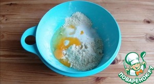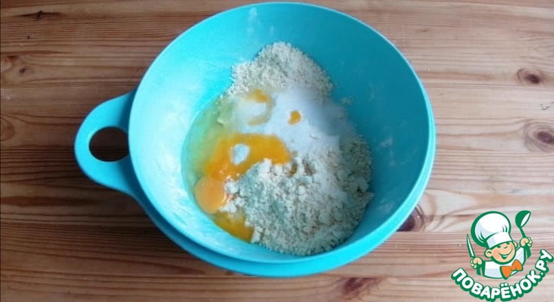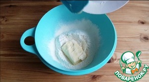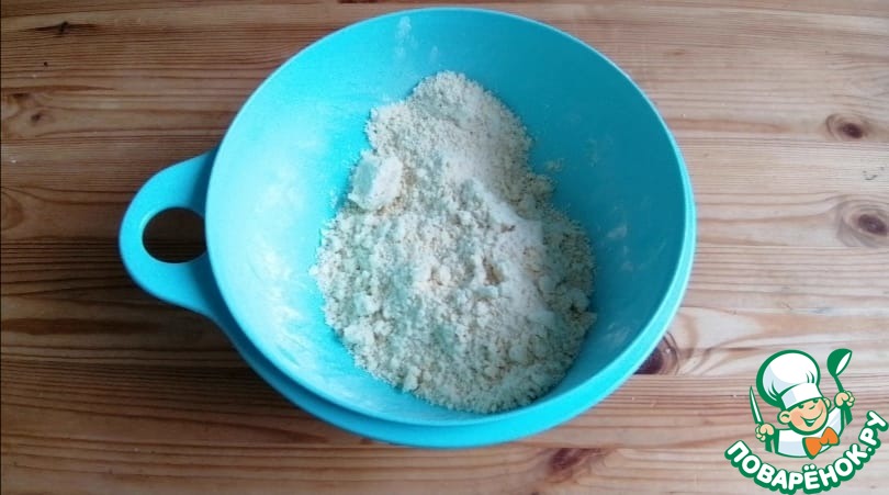 Просеиваем муку смешиваем с разрыхлителем, добавляем масло.