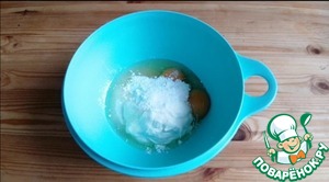 В сметану добавляем яйца, сахар, ванильный сахар, кукурузный крахмал.