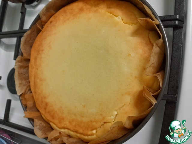 Яйца взбиваем с сахаром в легкую пену, добавляем растопленное сливочное масло и сметану. Всыпаем манку и даем ей набухнуть 10-15 минут. Добавляем творог и еще раз все взбиваем, в конце добавляем соду. Тесто должно получиться средней густоты.