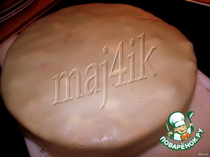Развернуть раскатанный марципан и аккуратно обтянуть им весь торт.