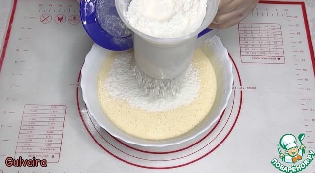 Муку смешиваем с разрыхлителем и небольшими порциями просеиваем в яичную смесь. |
