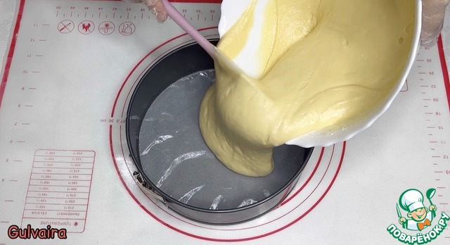 Заполняем форму тестом. Форму смазала маслом и на дно постелила пергаментную бумагу. Равномерно распределяем тесто по всей поверхности. |