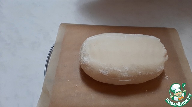 После того как тесто расстоялось в холодильнике, переворачиваем его на пергамент.