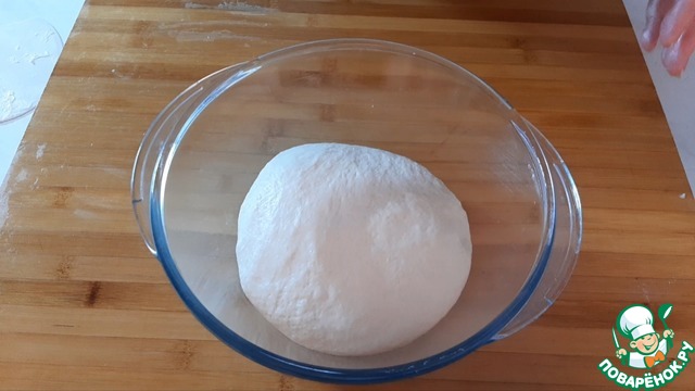 Выкладываем в миску, смазанную маслом. Прикрываем пищевой пленкой и оставляем на подъем на 3 часа. За время подъема необходимо 2 раза сделать обминку через каждый час.
