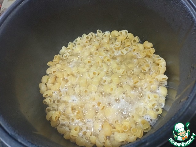 Отправляем в чашу макароны и воду — Режим «Тушение» 15 минут (либо Режим «Паста» по программе).