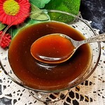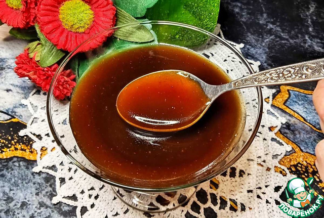 Мёд и сахар чуть уменьшила, уксуса чуть больше, имбирь только сухой был в наличии. А вот чеснока на мой вкус многовато, в следующий раз убавлю или заменю на сухой. На фото соус ещё совсем теплый. Спасибо Жене (Евгения 1976) за наводку.