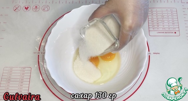 В миске смешиваем яйца, сахар и щепотку соли. Взбиваем блендером.