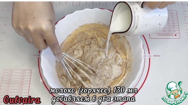 Далее добавляем горячее молоко в два этапа. Перемешиваем венчиком.