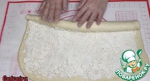 Достаём тесто, которое хорошо поднялось, раскатываем в тонкий пласт, примерно 0,5 см толщиной.