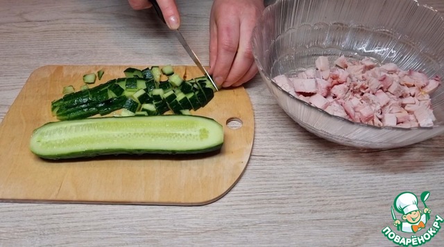Режем кубиками куриную грудку и огурец