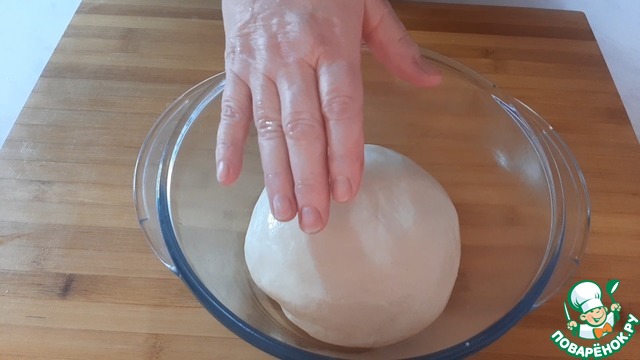 Немного вымешиваем руками и округляем. Выкладываем в миску смазанную растительным маслом. Прикрываем пищевой плёнкой и оставляем подходить на 3 часа. За это время делаем две обминки через каждый час.
