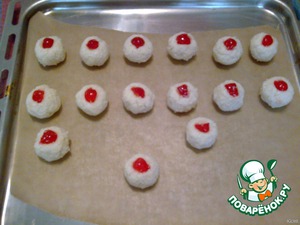 Катаем шарики размером с небольшои мандарин. сверху делаем небольшое углубление и ложим половинку вишни. |