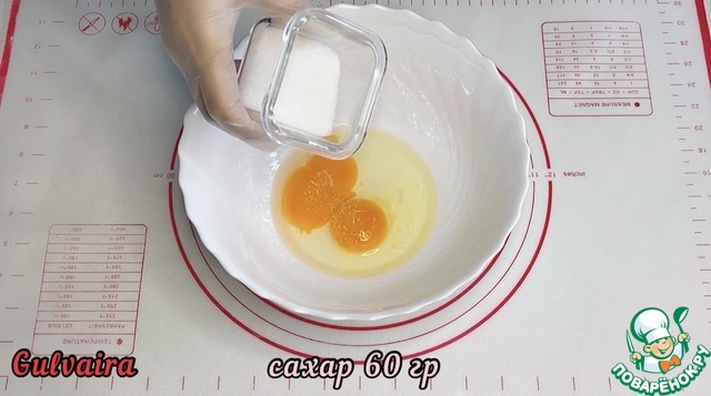 В миску добавляем яйца, щепотку соли, сахар и взбиваем 3-4 минуты до пышности.