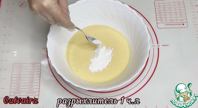 В тесто добавляем разрыхлитель и перемешиваем венчиком.