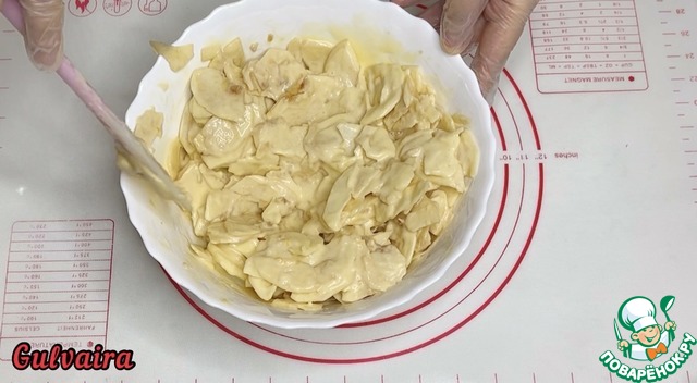 Далее в тесто добавляем яблоки и все хорошо перемешиваем, чтобы каждый кусочек был покрыт тестом.