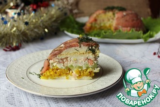 Плоское блюдо выложить листьями зеленого салата. Острым ножом пройтись вдоль стенок с тортом, затем аккуратно перевернуть форму на блюдо. Снять форму, а торт украсить зеленью и икрой. В готовом виде у меня торт получился 7 см высотой и 19 см диаметром.