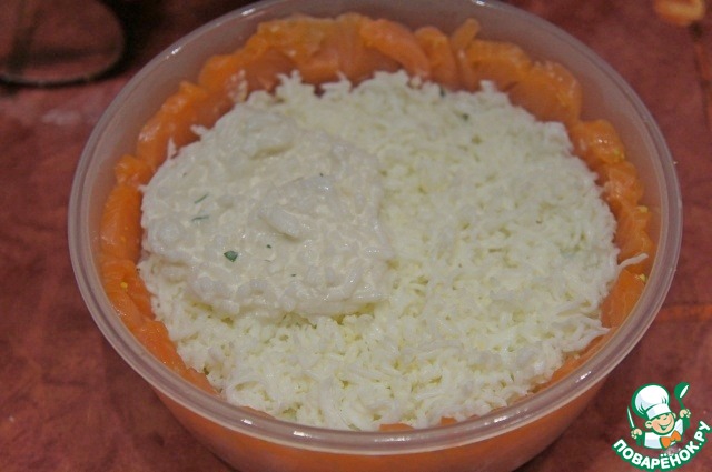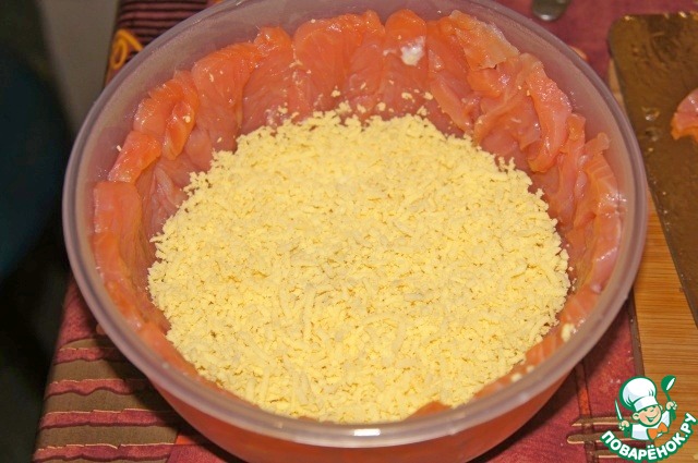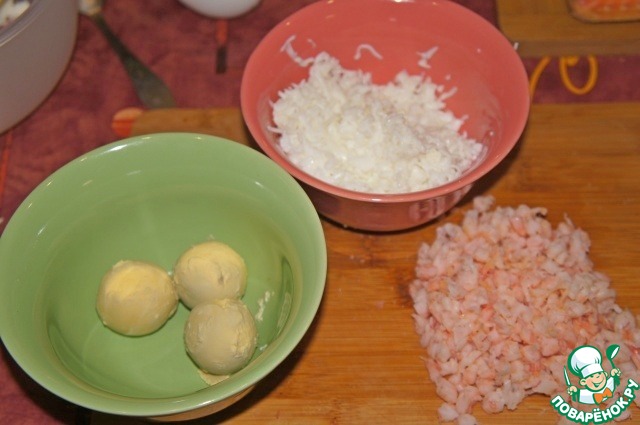 Натереть по-отдельности желтки и белки. Креветки опустить в подсоленный кипяток, быстро довести до кипения и варить 1 минуту. Остудить и очистить от панциря, мелко нарезать. Форму застелить пищевой плёнкой (я просто смазала растительным маслом. Креветки можно заменить на крабовые палочки, но вкус будет уже другим.