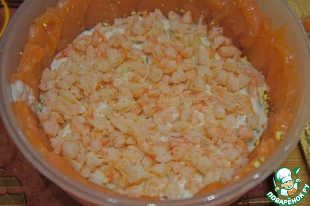 Выложить в форму на рыбу слоями: крем, желтки, крем, креветки, крем, белки, крем.