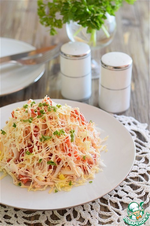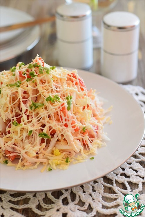 Сыр (любой полутвердый сыр) натереть на терке. Смешать все ингредиенты, заправить смесью домашнего майонеза и йогурта, перемешать. Попробовать на соль, посолить при необходимости. Все готово. Заправить салат можно просто майонезом, сметаной или йогуртом.