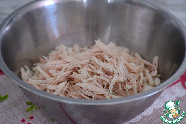 Куриное филе (отварное или запеченное) разобрать на волокна.